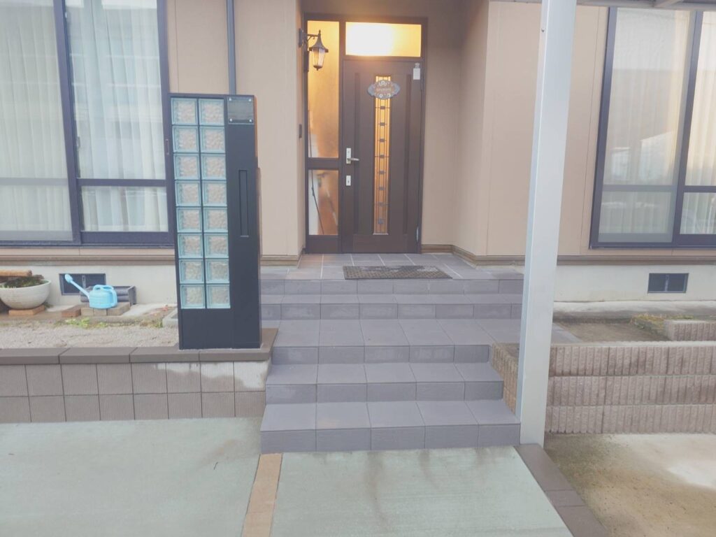 玄関ポーチは、タイルに劣化が目立つようになっており、新たに二段付け足すこともあり、一度既存タイルを剥がしてやり替えることになりました。